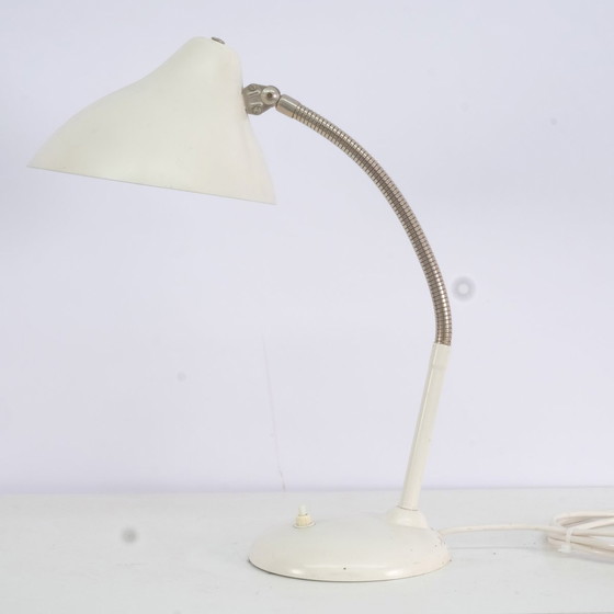 Industriële tafellamp, jaren 50 Productinformatie categorie Tafellampen Hoogte 36cm diameter 30 cm Gemaakt in Duitsland materiaal IJzer Kleur Ivoorkleurig Design 1950 - 1959 stijl Industrieel Productie periode 1950 - 1959