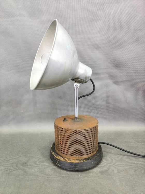 Authentieke industriële tafellamp uit de jaren 40 uit Tsjecho-Slowakije, oorspronkelijk een medische zonnelamp, nu omgebouwd tot een functioneel verlichtingsobject.