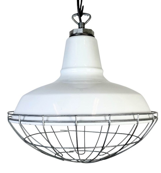 Industriële hanglamp van wit emaille, gemaakt door Benjamin in de Verenigde Staten in de jaren 60. De kap is wit geëmailleerd. De bovenkant en het rooster zijn van ijzer. De fitting is geschikt voor standaard E27/E26-lampen. Nieuwe kabel. Het gewicht van de lamp is 1,3 kg. De diameter is 30 cm. De hoogte van de lamp is 22 cm, met beschermrooster 33 cm.