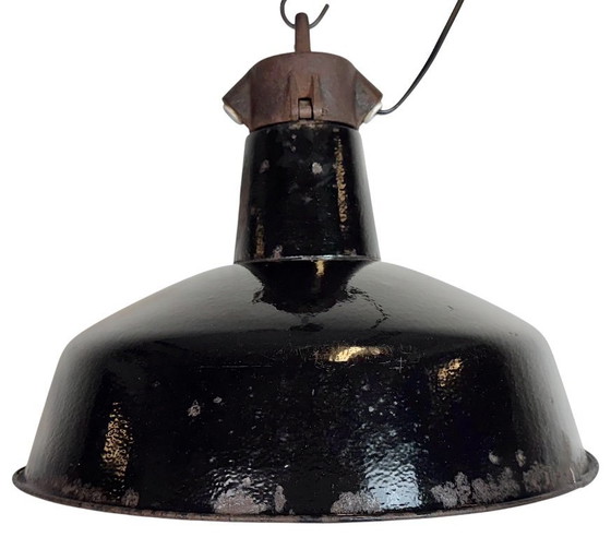 Industriële hanglamp van zwart emaille, gemaakt door Elektrosvit in voormalig Tsjecho-Slowakije in de jaren 50. De kap is wit geëmailleerd. De bovenkant is van gietijzer. De porseleinen fitting is geschikt voor standaard E27/E26-lampen. Nieuwe bedrading. Volledig functioneel. De lamp weegt 2,3 kg. De diameter van de kap is 40 cm.