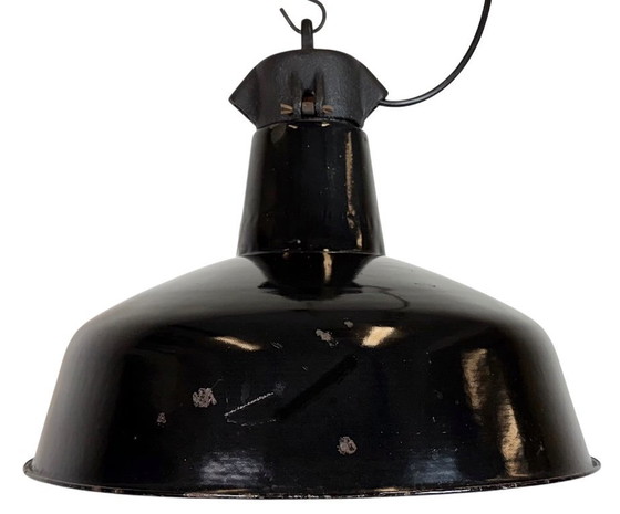 Industriële hanglamp van zwart emaille, gemaakt door Elektrosvit in voormalig Tsjecho-Slowakije in de jaren 50. De kap is wit geëmailleerd. De bovenkant is van gietijzer. De porseleinen fitting is geschikt voor standaard E27/E26-lampen. Nieuwe bedrading. Volledig functioneel. De lamp weegt 2,3 kg. De diameter van de kap is 40 cm.