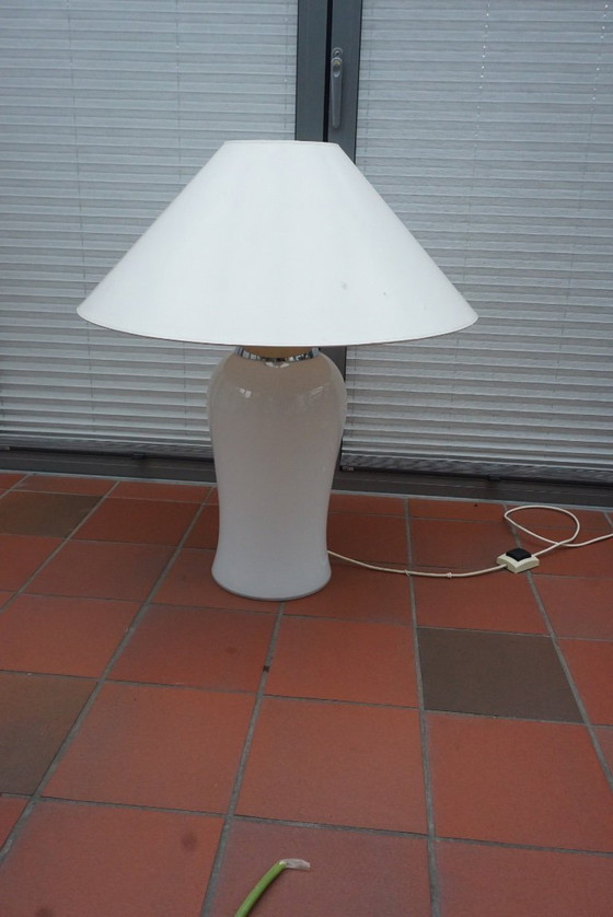 Deze zeldzame "Tschung" vloerlamp van Ingo Maurer werd in de jaren 80 geproduceerd door M-Design en combineert een gegraveerde opalen glazen behuizing van Vetri Murano met een originele stoffen kap. Beide lichtbronnen – de glazen behuizing en de kap – kunnen afzonderlijk worden in- en uitgeschakeld, waardoor een zacht, grafisch samenspel van licht ontstaat. De lamp is gemerkt met Vetri Murano op het glas en draagt het originele M-Design label op de voet; een identiek model is gepubliceerd in "Ingo Maurer – Designing with Light" van Bernhard Dessecker op pagina 181 (rechtsonder). Modellen van dit ontwerp komen zeer zelden op de markt; er is nog geen verkoop van deze variant geregistreerd in de belangrijkste veilingdatabases. De lamp is in goede vintage staat met gebruikssporen die passen bij de leeftijd. De originele kap vertoont enkele vlekken en lichte slijtage, die meestal beter zichtbaar zijn op de foto's dan in werkelijkheid. Deze lamp wordt verkocht in originele staat. Een gekwalificeerde elektricien dient vóór gebruik de elektrische veiligheid te controleren en het onderhoud uit te voeren.
