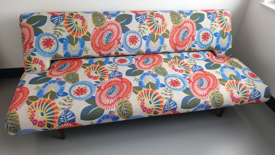 Uniek luchtige bedbank van Innovation Unfurl in Wild Flower design. Prima comfort door het gebruik van pocketvering. De rugleuning is verstelbaar (2 hoogtes). Deens merk. Houten poten. Breedte buitenmaat 200cm, uitklapmaat 120 cm, diepte 85 cm, rug hoogte 83cm en zithoogte 40 cm. Zeer goede staat.