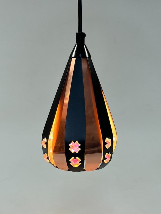 Mooie Deense druppelhanger hanglampje ontworpen door Werner Schou en in de 1960's geproduceerd door Coronell Electro A/S. Hij bestaat uit zes panelen van koper en zes panelen van zwart gelakt metaal met in elk twee stukken parelmoerglas. Door zijn design verspreid hij een mooi warm licht. Goede vintage staat, vertoont kleine gebruikssporen, maar valt tijdens gebruik niet op.