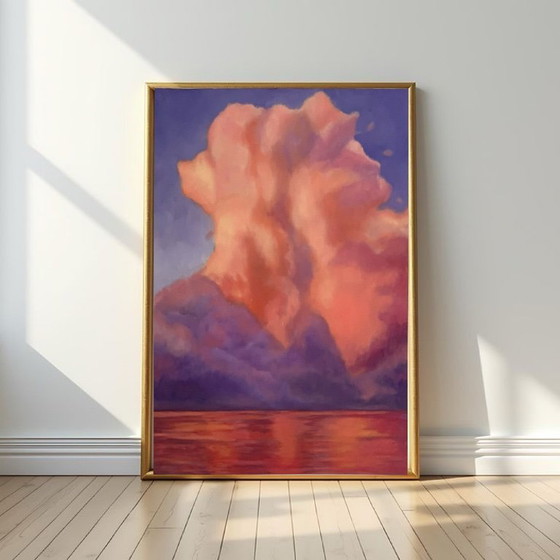 Dit olieverf schilderij vangt een krachtig natuurmoment waarop de lucht transformeert in een explosie van kleur. Zachte, vurige tinten oranje en roze dansen door imposante wolken die zich torenhoog verheffen boven een spiegelgladde zee. De paarse schaduwen onderin geven diepte en een mystieke sfeer aan het geheel. Het licht lijkt te ademen, alsof de hemel zelf tot leven komt op het grensvlak tussen dag en nacht.