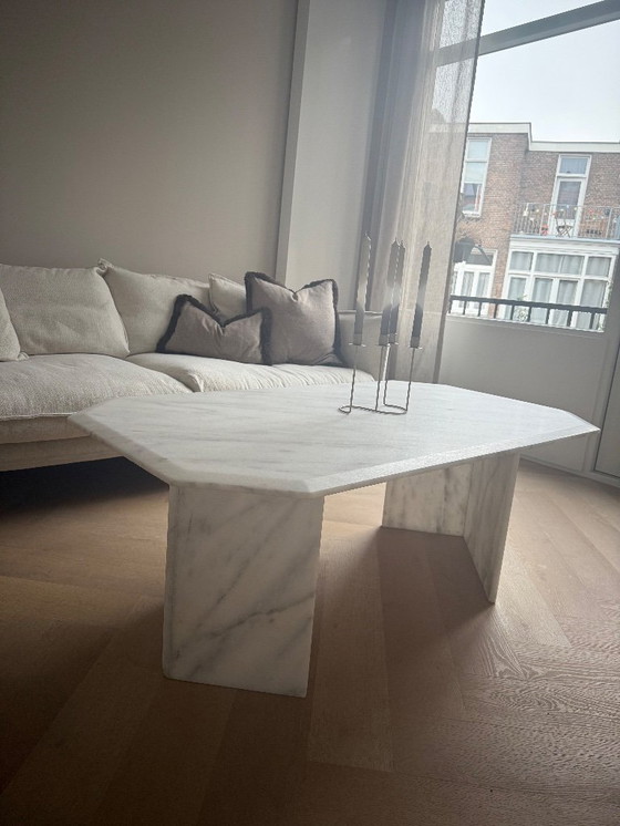 Prachtige vintage salontafel van Carrara marmer met grijze nerf, Italiaans design. De tafel bestaat uit drie delen: twee poten en een tafelblad. Past perfect in een japandi, brocante of hotel chique interieur. Stijlvol en tijdloos! De tafel is circa 75cm breed, 136 cm lang en 49 cm hoog. Staat op twee losse poten.
