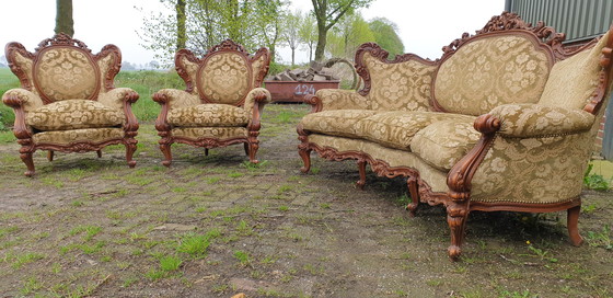 Ervaar de pracht van de Italiaanse barok met deze weelderige bank en bijpassende fauteuils. Deze set straalt elegantie uit met zijn rijke houtsnijwerk en luxueuze stoffering, perfect voor een klassiek interieur.