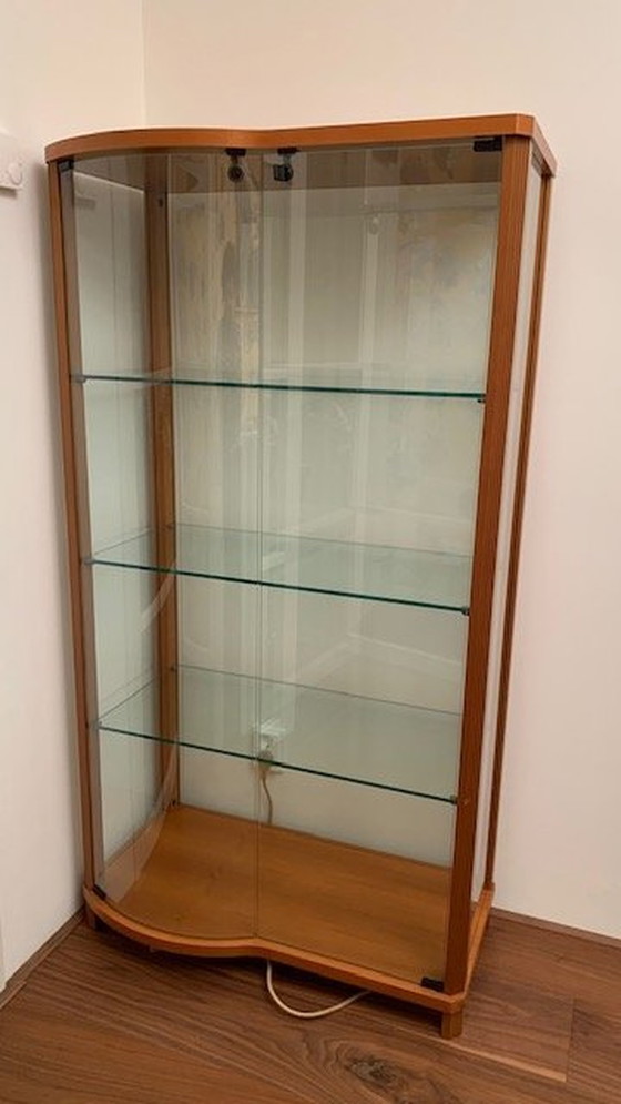 Bijzondere Italiaanse vitrinekast van licht kersen/notenhout (fineer) en glas met 2 glazen planken en 3 deuren, waarvan één gerond. Staanders 'gekarteld'. 30 jaar gekocht bij Mobilia Woonstudio in Amsterdam. Afmetingen: diep 38/45 cm x hoog 157 cm x breed 84 cm. Bij een glasplaat is in de hoek klein scherfje af (zit aan de achterkant en boven leggertje - valt niet op) en 2 kleine beschadigingen/krasjes (weg te werken door ze 'op kleur' te maken)m zie de foto's.