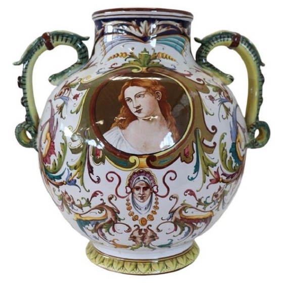 We presenteren deze prachtige grote vaas uit de jaren 1950, gemaakt in Faenza, Italië. De vaas is gemaakt van polychroom geglazuurd keramiek. De opvallende, klassiek geschilderde decoratie die elke kant van deze vaas siert, zal zeker in het oog springen. Op de ene kant staat een portret van een jonge vrouw in het midden en op de andere kant een prachtig landschap.
