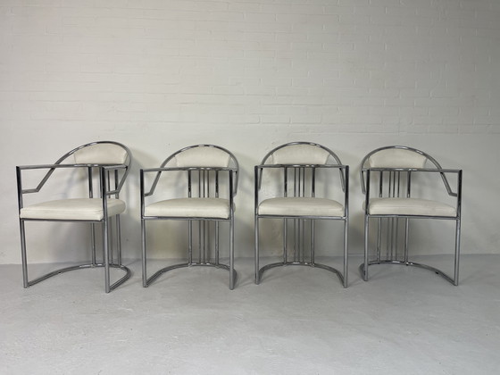 Deze set van vier Italiaanse stoelen uit de jaren 80 illustreert perfect de elegantie en het gedurfde design van die tijd. Elke stoel heeft een verchroomd metalen frame met gebogen armleuningen en poten, wat de set een vloeiende en verfijnde uitstraling geeft. De halfronde poten voegen een onderscheidende touch toe en geven de stoelen een gevoel van lichtheid.INDUSTRIE79