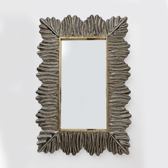 Wandspiegel van bronskleurig Muranoglas. Met zijn prachtige vorm en uitstekende afmetingen is de wandspiegel een echt designobject. De structuur van de wandspiegel is gemaakt van hout, waarin het Muranoglas is verwerkt. De spiegellijst bestaat uit een reeks bladeren die als bakstenen naast elkaar zijn geplaatst. Rondom de spiegel zijn enkele messing sierlijsten geplaatst. De spiegel kan zowel horizontaal als verticaal worden gemonteerd. Gemaakt door Muranomeesters in geblazen glaspasta met sporen van goudpoeder erin, is de wandspiegel uniek in zijn soort.