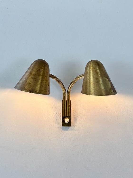 Jacques Biny, Frankrijk, 1950, dubbele verstelbare wandlamp van gepatineerd messing.