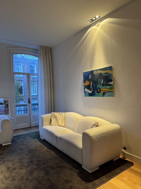 Te koop aangeboden: originele Jan des Bouvrie driezitsbank in een elegante crème/witte stof.