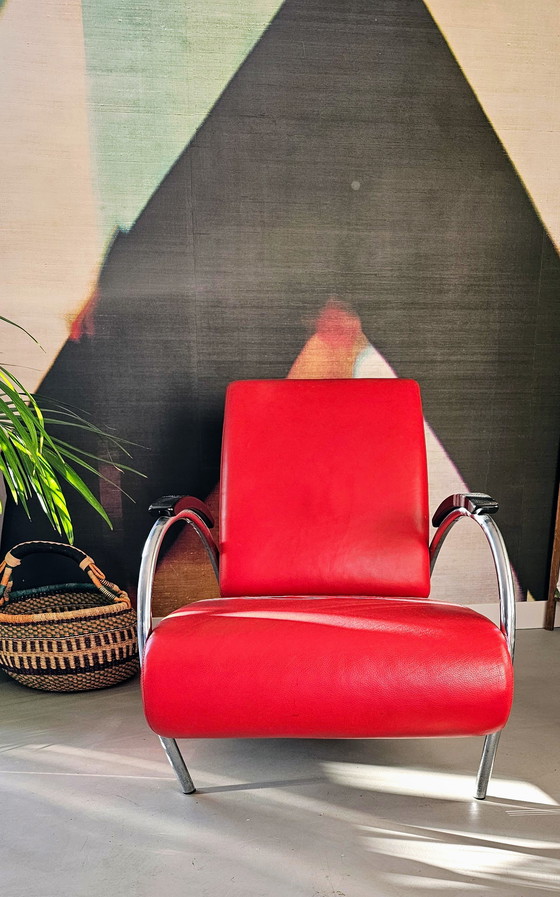 Deze moderne Jan des Bouvrie armstoel is een stijlvolle toevoeging aan elk interieur. Bekleed met hoogwaardig rood leer en voorzien van een metalen frame, straalt deze stoel zowel comfort als elegantie uit. Perfect voor een eigentijdse woonkamer of kantoorruimte.