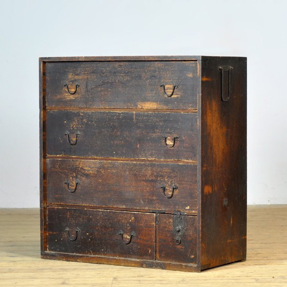 Traditionele Japanse Tansu-ladekast uit de jaren 1870. Vervaardigd tijdens de late Meiji-periode (1868-1912). Dit meubelstuk straalt authenticiteit en karakter uit. De kast heeft een warme, verweerde uitstraling die de tand des tijds heeft doorstaan. Functioneel en charmant, deze Tansu biedt veelzijdige opbergruimte, perfect voor het bewaren van documenten of persoonlijke spullen. Een meubelstuk dat een unieke, historische toets geeft aan elk modern of klassiek interieur.
