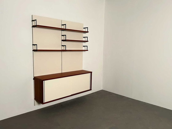 Zeer mooi wandmeubel uit de Japanse serie ontworpen door Cees Braakman voor UMS Pastoe in 1958. Het bestaat uit een zwevend dressoir met schuifdeuren en vijf originele teakhouten planken, ondersteund door zwarte rechthoeken die ook dienst doen als boekensteunen.