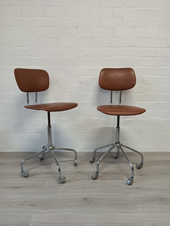 Ervaar de tijdloze elegantie van de jaren 50 met deze verstelbare bureaustoelen. Deze stoelen combineren een klassieke uitstraling met moderne functionaliteit, perfect voor elk kantoor of studeerkamer. De rijke bruine leren bekleding biedt een comfortabele zitervaring, terwijl het stevige metalen frame zorgt voor duurzaamheid en stabiliteit. De stoelen zijn in hoogte verstelbaar, waardoor ze zich moeiteloos aanpassen aan uw werkruimte. Voeg een vleugje vintage charme toe aan uw interieur met deze unieke stukken. Neem vandaag nog contact met ons op voor meer informatie of om deze prachtige stoelen aan uw collectie toe te voegen.