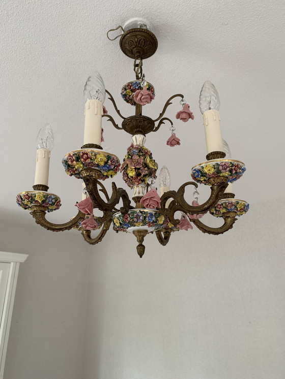 Dit is een prachtige Italiaanse kroonluchter uit 1950 met prachtige porseleinen bloemdecoraties. De kroonluchter heeft een prachtige combinatie van goudkleurig metaalwerk en 12 kleurrijke porseleinen bloemen en voegt een vleugje vintage elegantie toe aan elke kamer. Het ingewikkelde ontwerp en vakmanschap weerspiegelen de Italiaanse ontwerpstijl van die tijd, waardoor het een perfect pronkstuk is voor liefhebbers van een klassieke inrichting.