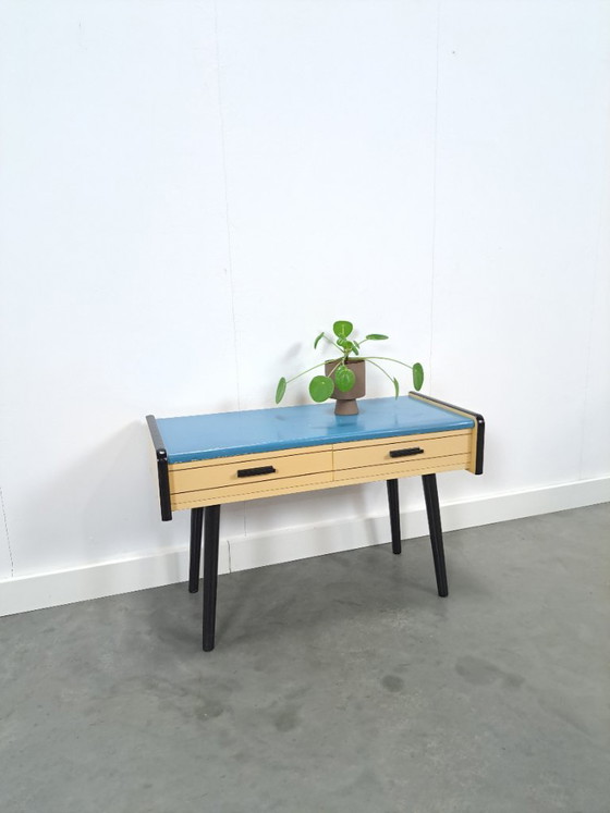 Leuk vintage ladekastje uit de jaren 50. Het kastje komt uit Oost Duitsland en heeft een mooie mix van vintage blauw, beige en zwart. Het kastje heeft 2 kunststoffen lades en vlotte schuine zwarte poten.