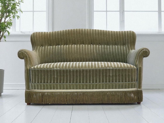 Deense tweezitsbank uit de jaren 60. Origineel groen gestreept meubelvelours, beukenhouten poten, veren in de zitting. Originele goede staat: geen geurtjes, geen vlekken en een stabiele constructie. Gefabriceerd door een Deense meubelmaker rond 1955-60. Origineel Scandinavisch vintage design rechtstreeks uit Denemarken. De bank is gecontroleerd door een vakman.
