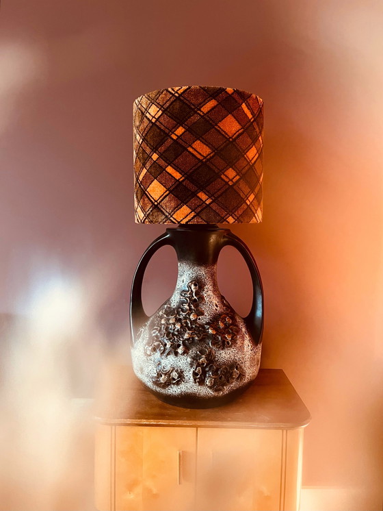 Een zeer expressieve grote lava vloerlamp – met het allerbeste van het Duitse 60-70 design van het midden van de 20e eeuw. 'Richard Essig' is een veelgeprezen Duitse kunstenaar uit die tijd. Dikke donkere chocoladebruine tinten met crèmekleurige bubbelende lavaglazuur langs de gaatjes, waardoor het binnenlicht helder kan gloeien en warme lichtstippen op de vloer werpt, wat een warm levendig sprankelend effect geeft.