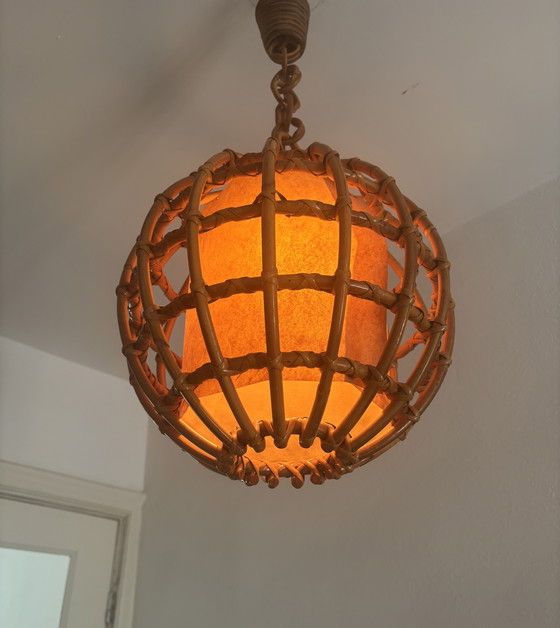 Deze boho hanglamp van rotan en bamboe uit de jaren 1970 is een charmante aanwinst voor elke ruimte. Het bolvormige ontwerp heeft een geweven rotan buitenkant die een warme, oranje binnenkap omhult, waardoor een gezellige en uitnodigende gloed ontstaat wanneer de lamp brandt. De natuurlijke materialen en het ingewikkelde vakmanschap weerspiegelen de bohemienachtige stijl van die tijd, waardoor het een perfect stuk is voor liefhebbers van vintage esthetiek. Ideaal om een vleugje retro charme toe te voegen aan je interieur.