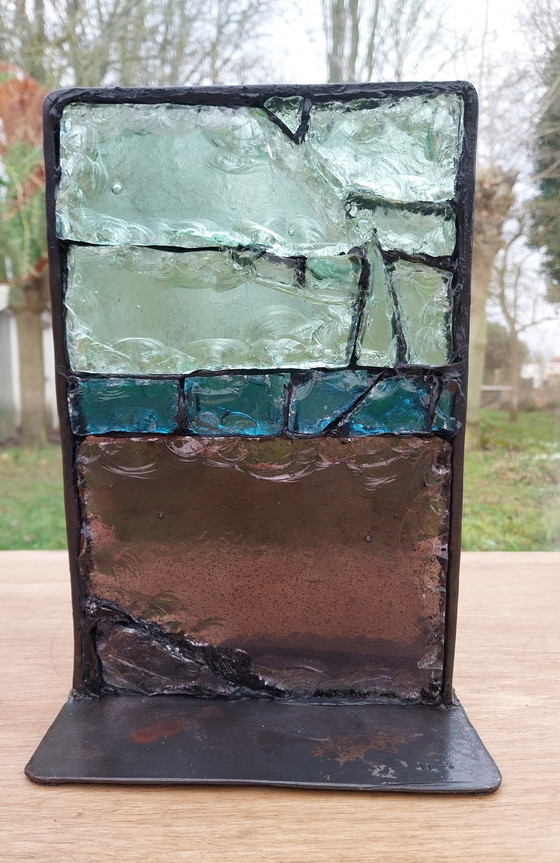 Surrealistische sculpturen in smeedijzer. JLB werkt vooral met smeedijzer soms gecombineerd met glas. Maar hier koos hij voor een kleurrijk tafereeltje gevat in een smeedijzeren rand die desniettemin een diepere boodschap verbergen, die van de scheiding tussen 2 werelden. Onze wereld gescheiden van de onderwereld door de mythische rivier de Styx. Het 2 cm dikke glas (albertini) werd in de massa gekleurd met natuurlijke oxiden. De met de hand gekapte blokken werden aan elkaar gekit met zwarte silicone. De smeedijzeren rand kreeg een coating die zorgde voor de bruinzwarte glans. Uniek gesigneerd werk uit 2024 Afmetingen : 30 cm hoog x 18 cm breed x 15 cm diep
