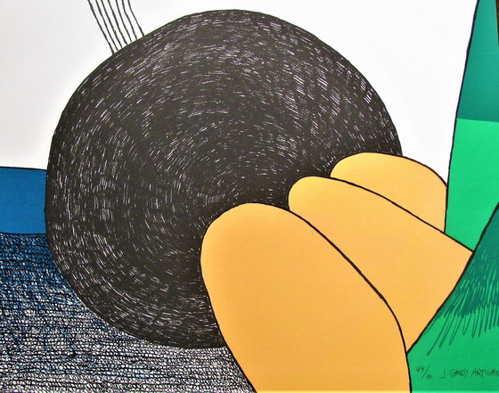 Grote lithografie, door de kunstenaar in potlood genummerd op 80 exemplaren en gesigneerd. Afmetingen 63 x 80 cm. In perfecte staat, enkel liggend bewaard gebleven in ladenkast. Joan Gardy Artigas is een Spaanse surrealist, keramist van de tweede generatie en een omarmer van het modernisme in zijn kunstwerken. Hij was een vriend en nauwe medewerker van Joan Miró. Hij was een collega van Alberto Giacometti, en werkte ook samen met Georges Braque en Marc Chagall. Joan Gardy Artigas staat bekend om de creatie van 7.200 tegels van de "Miró Wall", een keramische muurschildering met surrealistische figuren en wezens ontworpen door Miró voor het Wilhelm Hack Museum in Ludwigshafen, Duitsland. Hij staat ook bekend om zijn "Gaudi-bekleding met tegels", onderdeel van het kunstwerk "Vrouw en Vogel", een 22 meter hoog beeldhouwwerk ontworpen door Miró en gelegen in het Parc Joan Miró in Barcelona, Spanje (zie foto). Zijn grote keramische muurschilderingen en sculpturen zijn over de hele wereld verspreid, waaronder Harvard University, UNESCO (Parijs), Fondation Maeght (St. Paul), de Wereldtentoonstelling van 1970 in Osaka, de luchthaven van Barcelona, het Kunsthaus in Zürich, het hoofdkantoor van IBM (Barcelona) en een keramische muurschildering van 60 meter (200 voet) voor het Palais des Expositions et des Congres de Madrid. Joan Gardy Artigas heeft tentoongesteld in veel Europese, Japanse en Amerikaanse galerijen en musea, waaronder het Meadows Museum of Spanish Art aan de Southern Methodist University in Dallas, het Hispanic Institute in New York en de bekende Galerie Lelong in Parijs. In 1996 werd in Barcelona een grote overzichtstentoonstelling van zijn werk in alle media gehouden en in 1998 werd in de Fundació Pilar I Joan Miró in Palma de Mallorca een grote tentoonstelling gehouden waarin Miró’s samenwerking met Josep Llorens Artigas (zijn vader, de favoriete keramist van Picasso en Miró) en Joan Gardy Artigas werd gedocumenteerd. Verzending alleen binnen de Europese Gemeenschap. Verzendkost: binnen België: 14 €; naar Nederland, Duitsland, Luxemburg of Frankrijk: 22 €; naar alle andere landen van de E.G.: 40 €.