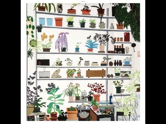 De speelse en uitnodigende stillevens van Jonas Wood tonen alledaagse voorwerpen in verwrongen, overlappende en technisch gekleurde staten – met een esthetiek die doet denken aan het grafische ontwerp uit de jaren 90 en de hoekige interieurs van Henri Matisse’s schilderijen van slaapkamers. Of het nu op canvas of zeefdruk is, de grillige composities van Wood tonen vaak keramische vaten met ingewikkelde patronen (gemaakt door zijn vrouw, keramist Shio Kusaka), levendig groene planten, planken en sportuitrusting.