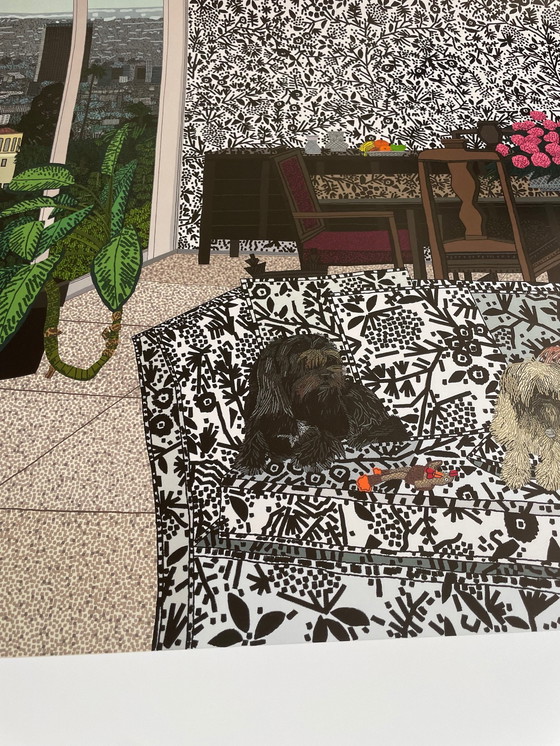 Robot and Bear toont de honden van de kunstenaar in een gestileerd appartement, afkomstig uit een interieurtijdschrift, met uitzicht over Los Angeles. De poster is in zeer goede staat en wordt veilig verzonden in een beschermende koker.