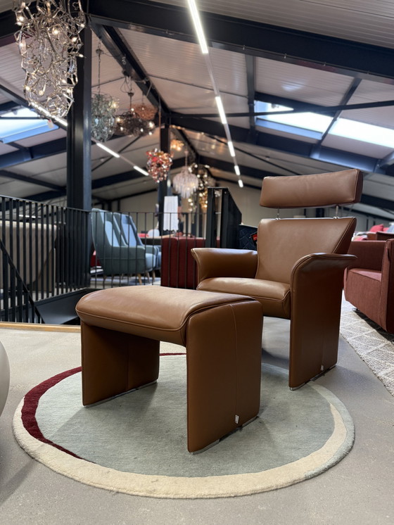 Nieuw Jori Aqua fauteuil met bijpassende voetenbank uitgevoerd in Celia leder in de kleur tabacco. Hoofdsteun is in hoogte verstelbaar. Nieuwprijs €3.922,- Afmetingen 72xd79xh104/112 zh47 zd52 poef 51x60xh40cm. Nu te koop voor €2495 als set.