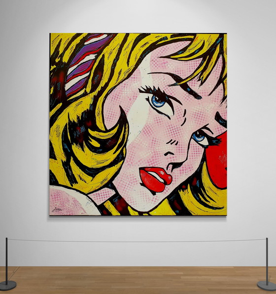 Werk gemaakt in Pop Art stijl (naar Lichtenstein) van de Nederlandse professionele / hedendaagse kunstenaar Jovan Srijemac (1962).. Werk is geschilderd met acrylverf, paletmes penseel acryl marker en acryl spray. Dit werk past goed in een modern interieur of kantoorruimte. Staat van het werk: uitstekend (nieuw), gevernist, met echtheidscertificaat en klaar voor ophangen .Werk graag komen ophalen in mijn studio en bespaar dure verzend kosten voor verzending deze format van 100x100x2cm. "De chaos van ideeën die in mijn hoofd zijn ontstaan, de innerlijke ontheemde energie, wil eruit komen als een vulkaan en zo een explosie en een symfonie van kleuren op het doek worden, omlijst met materie, figuren, gezichten of abstracte compositie.’’ Jovans werk staat dicht bij de expressionistische stijl, maar hij experimenteert graag met popart en action painting. . Het meeste werk is geschilderd met paletmes. Kleur is op het doek aangebracht met een gevoel en emotie die diep uit zijn ziel komt. Thema is minder belangrijk als hij tevreden is met de compositie en de kleur. Experimenteren in kunst, met stijlen, technieken, kleuren, enz., is erg belangrijk voor Jovan.