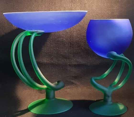 Twee “Octopus/Jellyfish/Spider Art Glass” stukken van Józefina (Krosno, Polen), een kelk en een schaal uit mat glas, blauw op 3 groene tentakels en voet. Let op, de kleuren van de stukken zijn niet 100% identiek (zie foto’s), wat uiteraard met het productieproces te maken heeft. Schaal: Hoogte: ca. 26 cm; Diameter: schaal ca. 21 cm; voet ca. 12 cm. Kelk: Hoogte: ca. 24 cm; Diameter: kelk ca.11,5 cm; opening ca. 8,5 cm; voet ca. 10 cm. Beide stukken bevinden zich in goede vintage conditie, met enkel krasjes.
