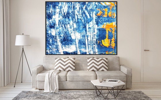 Het schilderij heeft een totale afmeting van 115 x 150 cm en de nodige ruimte aan elke rand om het op te spannen op een spieraam van 140 x 140 cm. Geschikte diepte van het spieraam: 2 - 5 cm.