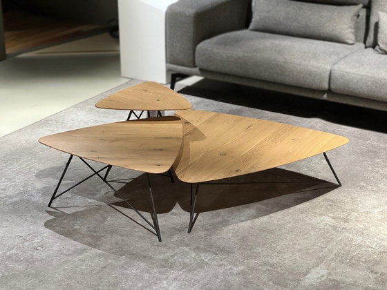 Showroommodel: Set van 3 bijzettafels Justin van bert plantagie Uitvoering: Eiken noestig bianco olie Frame fijnstructuur antraciet Afmeting: Small 52 x 48 x 44 cm Medium 77 x 71 x 37 cm Large 102 x 95 x 28,5 cm De prijs is voor de gehele set van 3 bijzettafels __ Deze stijlvolle salontafelset Justin van het designmerk Bert Plantagie bestaat uit drie organisch gevormde tafels met een verfijnd, driehoekig blad. De bladen van de tafels uit deze set hebben een hoogwaardige afwerking in eiken noestig bianco olie, wat de tafels een natuurlijke en rustige uitstraling geeft. Doordat de set uit drie tafeltjes bestaat, is er een flexibiliteit aan opstellingen. De drie tafeltjes hebben verschillende hoogtes en afmetingen, waardoor ze prachtig als één speels geheel geclusterd kunnen worden in het hart van de zithoek. Door de bladen deels over elkaar heen te schuiven, ontstaat er een dynamisch diepte-effect. Je bent echter niet gebonden aan deze vaste formatie; de hoogste tafel met het kleinste blad leent zich er bijvoorbeeld uitstekend voor om los van de groep te worden geplaatst. Zo transformeer je dit element in een handomdraai tot een praktische bijzettafel, ideaal voor een kop koffie naast de bank of als sfeervol rustpunt bij jouw favoriete fauteuil.