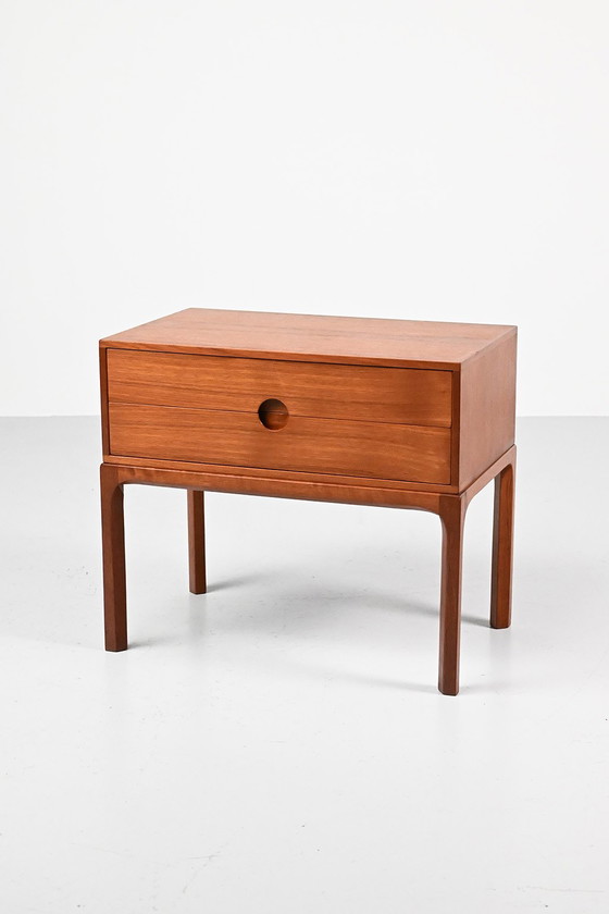 Kai Kristiansen model 384 kastje in de jaren 50/60 geproduceerd door Aksel Kjersgaard. Origineel is dit een nachtkastje maar deze misstaat zeker in de huiskamer. Dit teakhouten (deels fineer) kastje is een typisch Scandinavisch Mid Century Modern ontwerp. Eenvoudig met zeer veel aandacht voor detail. Kijk maar naar de mooie facet gevormde pootjes en het geïntegreerde ronde handgreepje.Dit meubel is in een goede vintage staat.