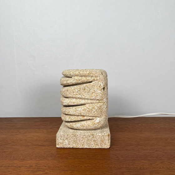 Kalkstenen tafellamp uit de jaren 1960-70, in de stijl van Gerard Esnault. Deze lamp van gehouwen steen heeft verschillende geometrische patronen.