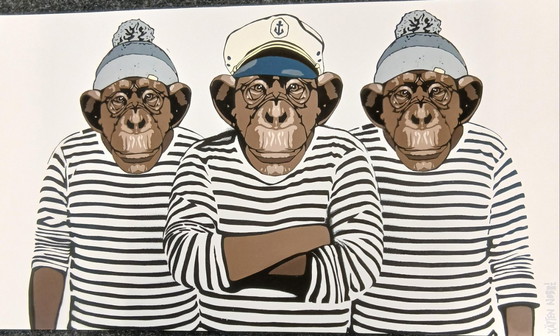 Ontdek het fascinerende kunstwerk 'Ringelshirt' van de gerenommeerde kunstenaar Paul Sous uit Aken, ook bekend als 'Captain Nobbi'. Deze giclée print op Hahnemühle Velvet papier toont drie chimpansees in gestreepte shirts, een kenmerkend motief van de kunstenaar dat zijn voorliefde voor gerecyclede materialen en humoristische beelden weerspiegelt.