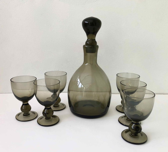 Prachtige vintage set uit de jaren 60 van rookbruin glas, bestaande uit 6 kleine glazen en een karaf van dik, prachtig rond handgeblazen glas. Perfect voor het serveren van drankjes aan het begin of einde van een maaltijd. Afmetingen: glazen h 9 d 5.3 - karaf h 16.5 + stop 7.5 - inhoud 50ml