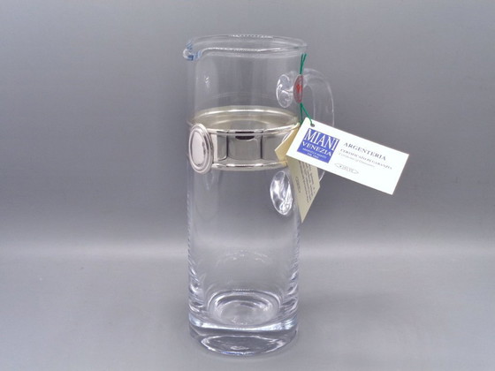 Geblazen glazen karaf met ovale band en handgegraveerd wapen van massief 925 zilver - gewicht 699,2 gram - hoogte 21 cm - breedte 13 cm - diameter 8 cm - inhoud 0,75 liter - geschikt voor water, wijn, prosecco of vruchtensappen - zilver gekeurd met staatsmerk 193VE en titel 925 - handgemaakt door Argenteria PG-MIANI uit Venetië - nieuw, nooit gebruikt - inclusief garantie - verzending via expreskoerier met trackingnummer