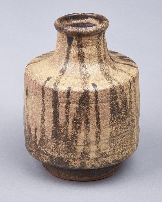 Karlsruhe majolica vaas met beige/bruin lopend glazuur uit de jaren 1970. Nummer G/138 Het ontwerp is van de keramist Friedgart Glatzle, herkenbaar aan het voorvoegsel G voor het nummer op de bodem. Zeer mooie staat zonder chips of barsten.