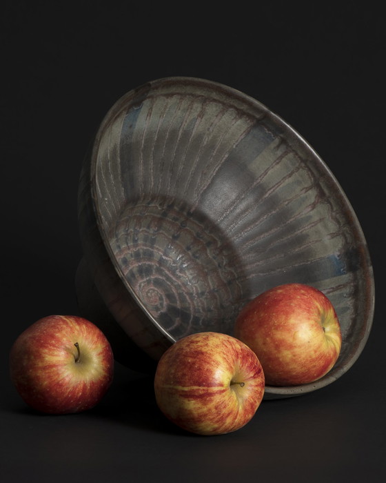 In tegenstelling tot in massa geproduceerd servies, spreekt dit stuk met de stille autoriteit van studiokeramiek: elke groef, glazuurgang en spiraalspoor in het interieur van de kom onthult de opzettelijke hand van de kunstenaar. De uitlopende rand en de verhoogde voet geven het een opgetild, bijna ceremonieel profiel - het nodigt niet alleen uit tot appels of citroenen, maar ook tot bewondering en dialoog.
