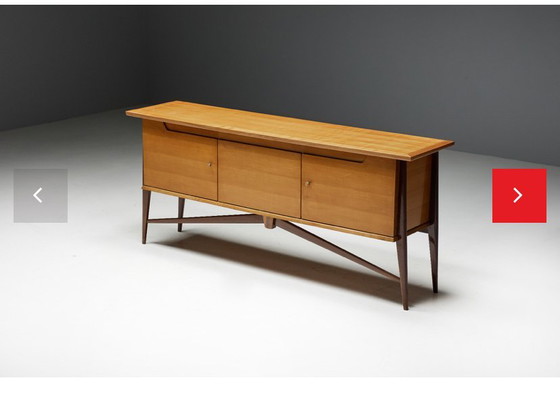 Maak kennis met dit bijzondere dressoir van het gerenommeerde merk De Coene, een toonbeeld van de elegantie van het Mid Century Modern design. Met precisie vervaardigd, creëren de strakke lijnen en de warme bruine houtafwerking een tijdloze uitstraling die naadloos aansluit bij elk verfijnd interieur.