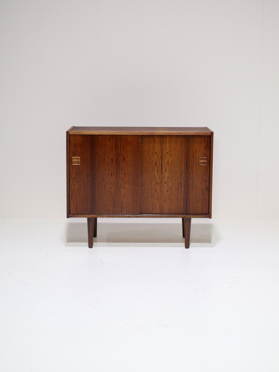 Prachtig dressoir uit Denemarken, jaren '60. Dit kastje heeft twee schuifdeuren met mooie greepjes en is gemaakt van palissanderhout met een bijzondere houttekening. De plank is in hoogte verstelbaar. Onder andere geschikt als platenkast / LP-kast of om om te bouwen tot badkamermeubel.