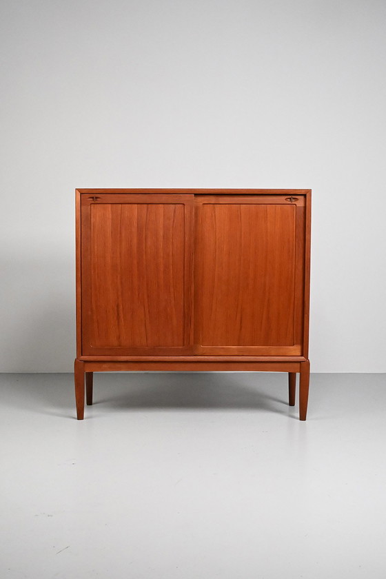 Kast van H.W. Klein voor Bramin. Gemaakt in Denemarken in de jaren 60.Deze teak en teak fineer kast heeft schuifdeuren (ruimtebesparend!) en barst van de prachtig uitgevoerde details.In een goede vintage staat.