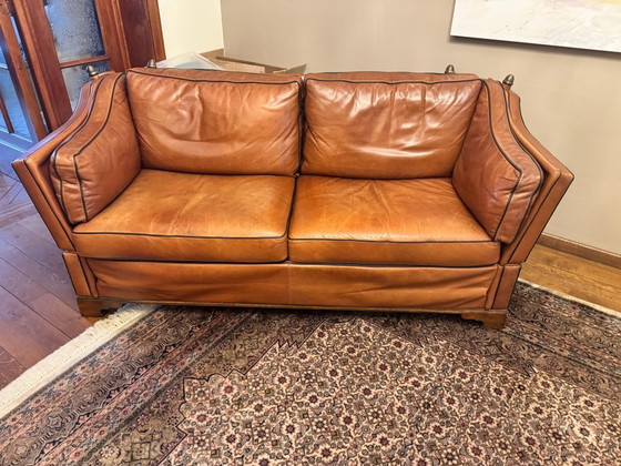 Ervaar het tijdloze comfort van deze klassieke leren zetel, perfect voor een elegante woonkamer. De warme bruine tint van het leer straalt een gevoel van luxe en verfijning uit, terwijl de stevige houten poten zorgen voor duurzaamheid en stabiliteit.