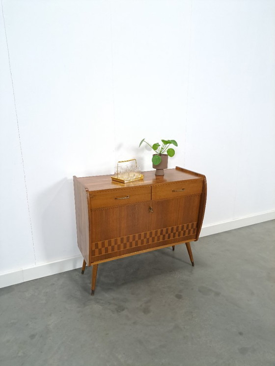 Stijlvol vintage kastje. Het kastje heeft mooie details, zoals geblokt patroon van fineer, elegante messing grepen en vlotte schuine messing poten. De kast heeft twee lades en een grote klepdeur met legplank. Onderin zit een opening voor kabels.