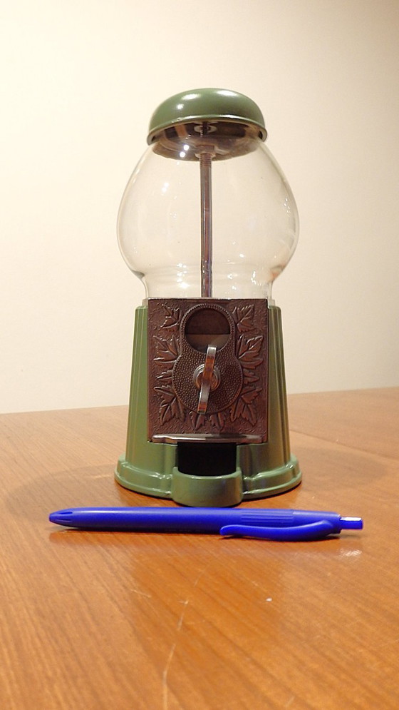 Kauwgomautomaat. Spaarpot. Geschikt als kauwgomautomaat, snoepautomaat, pindaautomaat, M&M's-automaat, of wat er ook maar in past. In perfecte werkende staat. Hoogwaardige materialen (geen plastic). Glazen koepel en metalen behuizing.