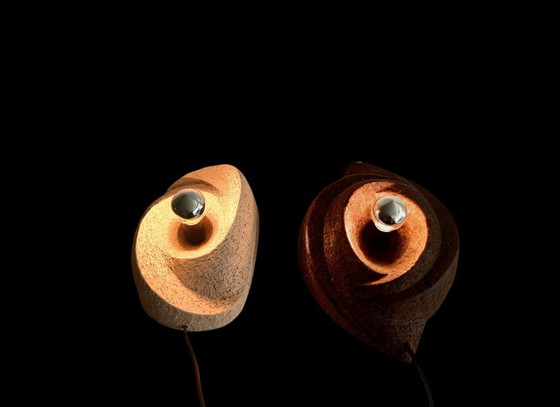Deze 70's lampen hebben een mooie abstracte organische vorm, de uitstraling van het ruwe aardewerk versterkt het organische karakter.