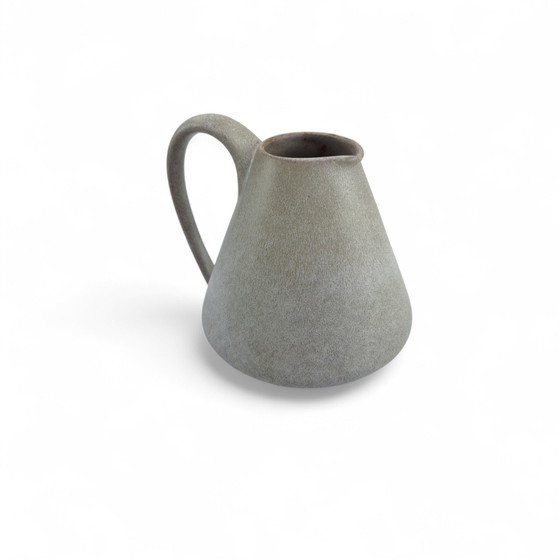 Deze kan van het aardewerk uit Hameln maakt indruk met zijn heldere, conische vorm en een fijn gestructureerd, mat oppervlak in een natuurlijke grijstint. De handgemaakte afwerking geeft het een rustieke elegantie, terwijl het ergonomisch gevormde handvat het makkelijk hanteerbaar maakt. Een functioneel en esthetisch stuk traditionele keramische kunst.
